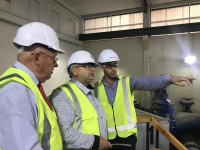 Mike Baker of Mainmark (right) explaining the injection process and locations at the Seaview Plant to Hutt City Mayor Ray Wallace (centre) and Hutt City Deputy Mayor and Wellington Water Committee Chairman David Bassett (left).
