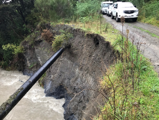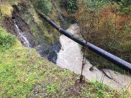 Fifty metres of new pipework was installed beneath the Boar Bush Gully Road to replace the section of water main lost to the collapse of the stream bank. That installation was completed by 3pm Saturday, and the road is now accessible, though further surfacing and finishing of the road is still to take place.