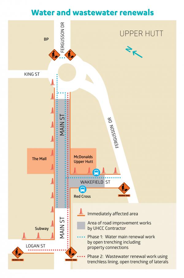 From 10 July to end of September 2017, Wellington Water will be renewing the aging water and wastewater pipes along Upper Hutt’s Main Street, Wakefield Street and Logan Street to improve the resilience of the infrastructure.