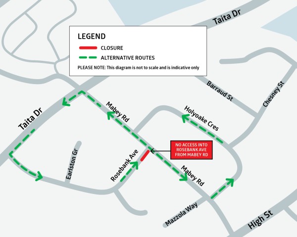At the corner of Mabey Road and Rosebank Avenue, a trench will be dug across part of the intersection. This will require temporary traffic management restrictions with a detour route via Mabey Road, Holyoake Crescent (eastbound) and Taita Drive (westbound).