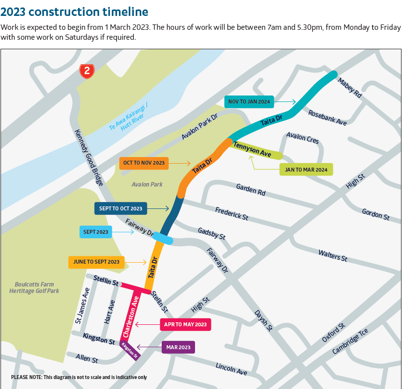 - Taita Drive will be one way temporarily (west bound) from the Mabey Road intersection through to Tennyson Avenue intersection. Bus-stops on this side of the road will remain operational.