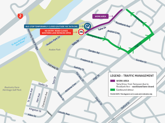 - Two bus-stops are affected by the east-bound road-closure (stop #9229 in Tennyson Ave, and #9231 outside #105 Taita Drive). Please use the next bus-stop east (just past Mabey Road intersection) if travelling to Taita or further north.