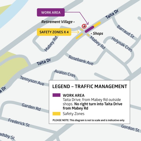 During the week of April 7 -12, there will be traffic management in place at Taita Drive (between Rosebank Ave and Mabey Road).
