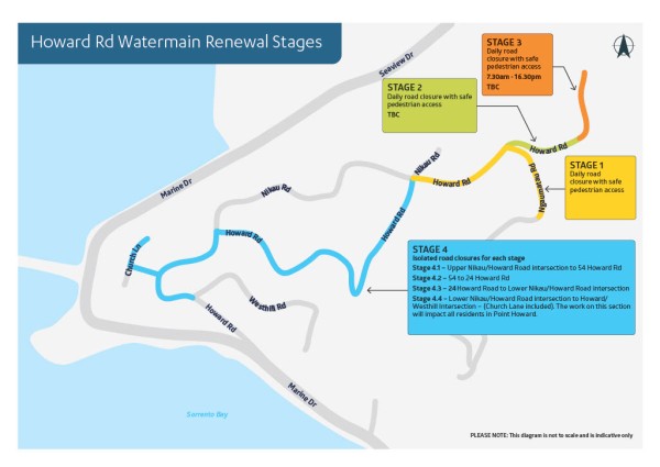 - Stage 4.4 – Lower Nikau/Howard Road intersection to Howard/Westhill Intersection - (Church Lane included) The work on this section will impact all residents in Point Howard. One lane of the road will be closed with stop-go traffic management in place during work hours outlined below. Please plan for 3-5 min delays. Estimated timeframe 85 days’ work effort.