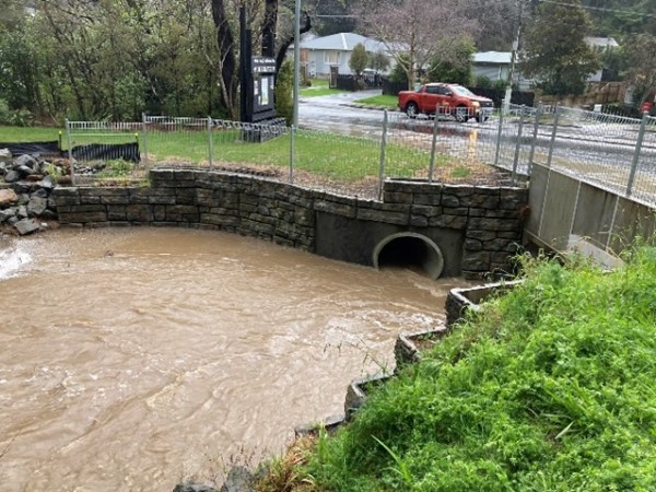 Images demonstrate culverts, widened stream and retaining walls during 26 August flooding