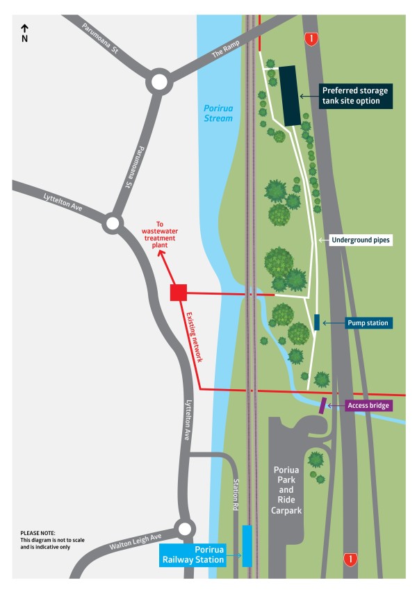 The tank will be located north of Porirua railway station, between SH1 and the railway line. It will hold up to seven million litres (about three Olympic-sized swimming pools) of wastewater when there is heavy rain.