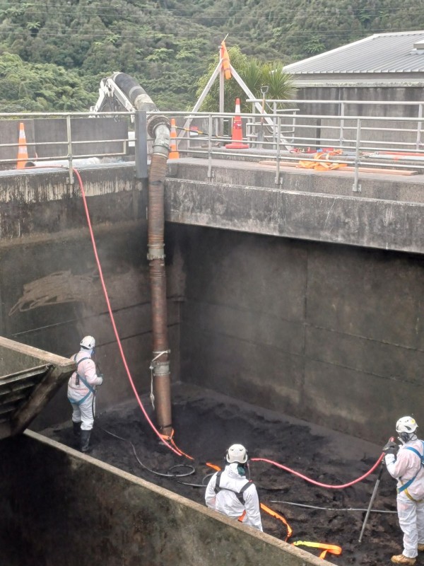 Progress in other key areas includes work fitting out the pump and plant room, completing the drainage pipework and starting work on refurbishment of filter 1 (image below showing the team water blasting the filter concrete structure ).