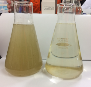 Here is an image of the influent [left] (the water that enters the wastewater treatment plant) and effluent [right] (the treated water as it leaves the treatment plant). These samples were taken from Moa Point wastewater treatment plant.